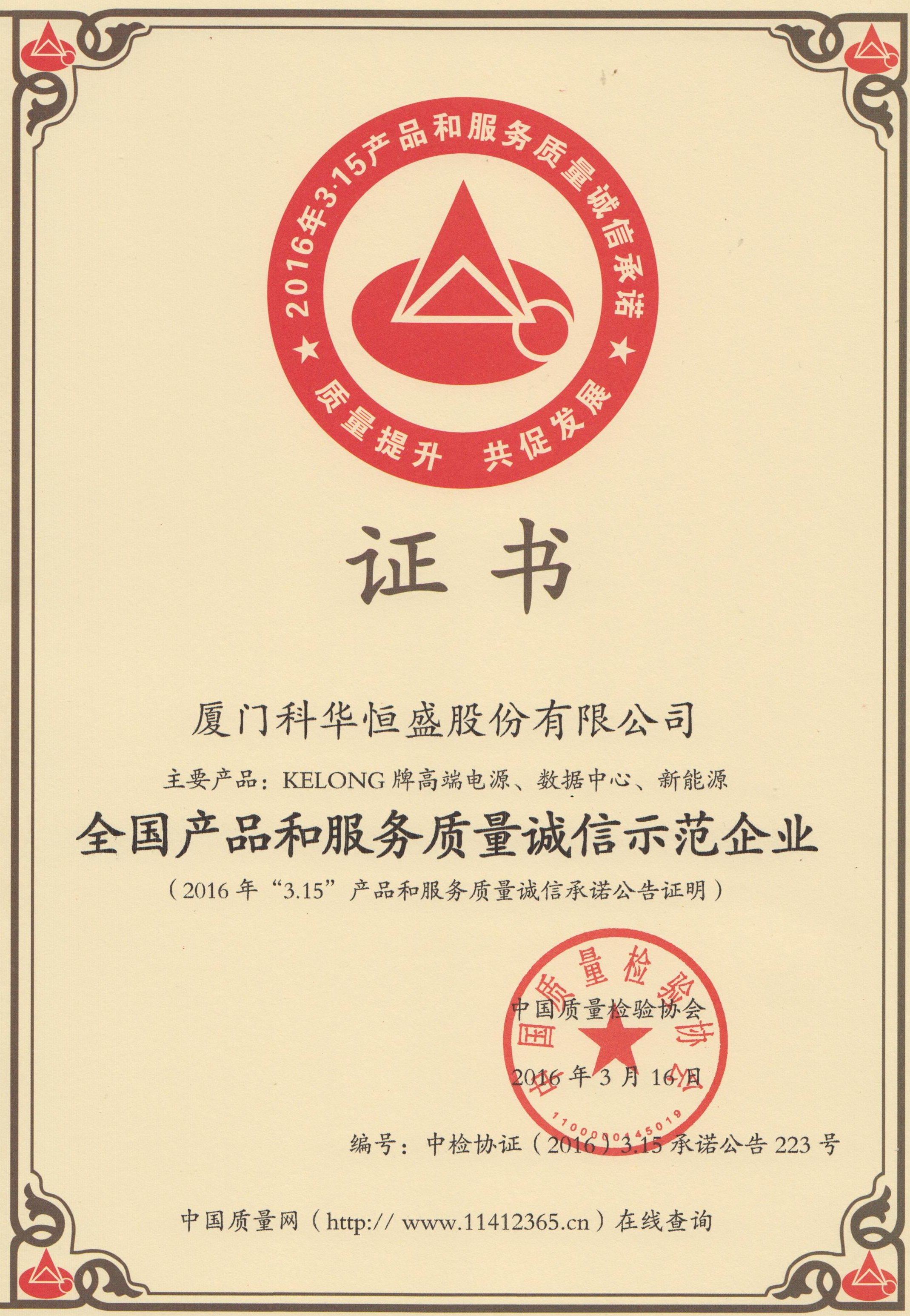 全国产品和服务质量诚信示范企业